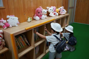 今日から10月(神無月)が始まりました。読書の秋でもあります。幼稚園の職員室横には絵本とぬいぐるみが置いてあるスペースがあり、園児たちはお気に入りの本を読んだり、ぬいぐるみを教室へ持って行ってごっこ遊びを楽しんでいます。