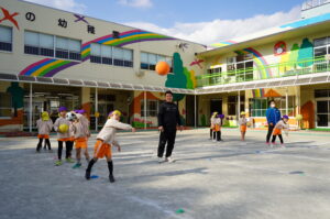 今日は、年中児と年長児の体育あそびでドッジボールをしました。まずは、ボールの投げ方の指導で、遠くに投げるには、手のひらにしっかりボールを乗せて、足・腰を使って投げることが大切ということやボールの受け方を教えてもらい、その後にみんなでドッジボールを楽しみました。