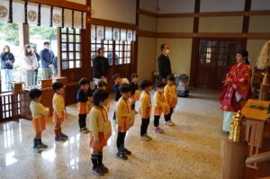1月生まれの誕生祭では、お祓いを受けた後、祢宜さんから久居八幡宮の神様に一つ成長した事を奉告していただき、参拝をしました。その後は、教室での誕生会や戸外あそびを楽しみました。