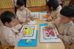 きく組では、ICTを活用した教材「こどもモードKitS」のアプリ「マジカルレンズ」を楽しみました。塗り絵をした火山やバスの絵に、キラキラやビーズなどをデコレーションし、完成した作品にiPadをかざすと、画面上に立体的に飛び出しました。自分たちの作品が動き出す様子に、園児たちは大興奮でした。