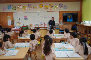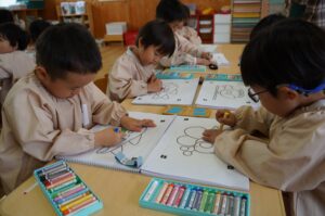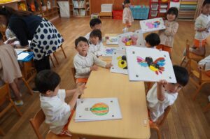 年中児のばら・きく組では、今年度最初のICTを活用した教材「こどもモードKitS」のアプリ「アートポン!」を楽しみました。「アートポン!」では、専用の用紙に描かれた模様に色を塗り、それをiPadで取り込むと、画面上で絵が動き出します。園児たちは、自分が描いた絵が動く様子を見ると喜びの歓声を上げていました。